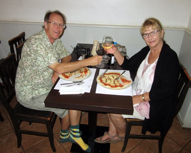 We ended walking in circles trying to find a specific restaurant that I had planned for us to dine at but it was no longer there.  We walked a bit without finding anything appropriate.  Finally I decided to just eat anywhere as we had to sit, drink wine and eat.  Guess who has sore feet?  The pizza was good as we both ate it all.  What better have for ones birthday while in Rome 🙂