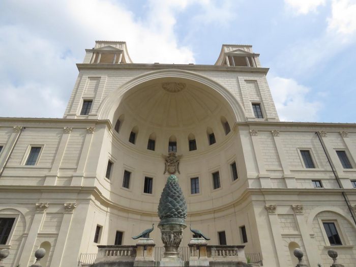 We are in the Pinecone Courtyard named for this 13 foot high bronze pinecone which dates back to Ancient Rome, 1st century BC.  It is flanked by two bronze peacocks.