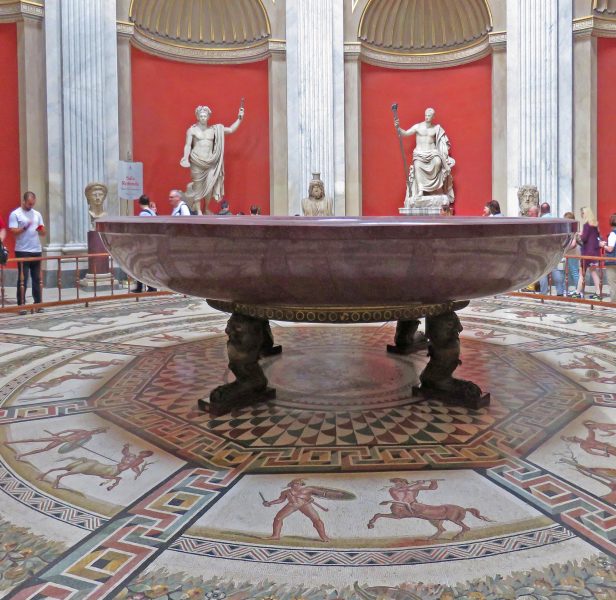 The Porphyry Basin set in the Rotunda Room.  Its circumference is 13 meters/forty feet.  About 2000 years ago Nero ordered a special bath for his Domus Aurea/Golden House.  Someone had to go to Egypt and get this giant rock from the porphyry quarry and haul it back to Rome and carve it.  Now that is an awesome bathtub.