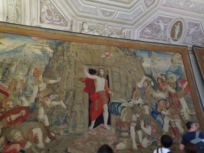 We are now in the Tapestry Hall.  The tapestries on the right were made in the 17th century and the ones on the left such a this one were made in the 1500’s.  Each of these tapestries, made of wool and silk and gold and silver thread, took years to make by the best weavers of the day who were from Flanders or Belgium.  This particular tapestry is called ‘ The Resurrection of Christ “.  As you approach it and look at Jesus’s eyes and keep walking all the while watching his eyes, you will see that his eyes have followed you as you walked left to right.  The masterful stitching provided a moving perspective.  Definitely one of the top ten in the Vatican must sees.