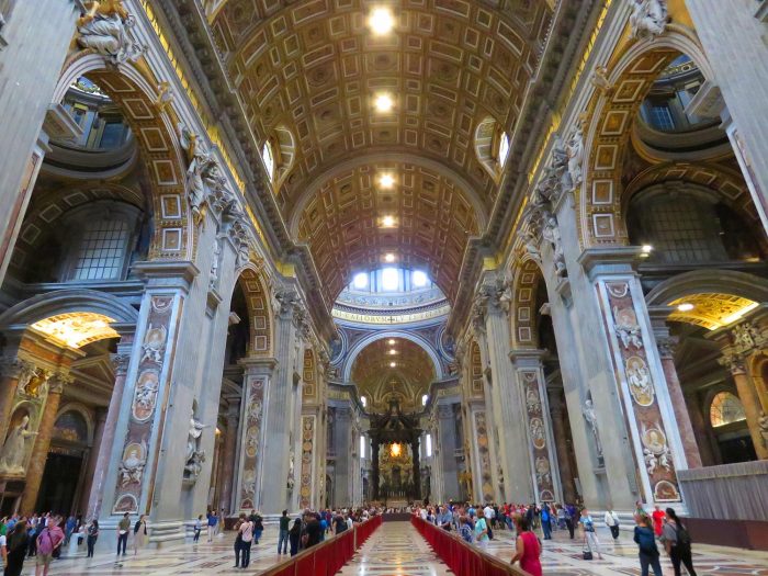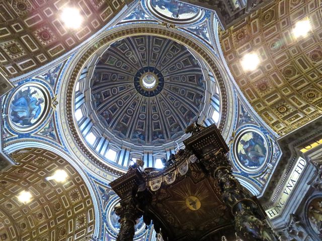 The Basilica has a very long and interesting history.  There are so many pieces of art inside that I just can’t mention them but it was very moving to be there. The dome that Michelangelo started working on in 1547 when he was 71 is above the dark brown alter in the middle background.