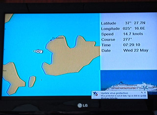 Today is Wednesday, May 22nd but you are likely reading this on Thursday, May 23rd. A year ago today we were in Rome and specifically at the Vatican when I turned 65, something I will never forget. So today I turn 66 and won’t forget that we left Mykonos early this morning and make a stop in Milos in the afternoon.
