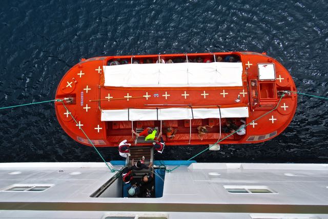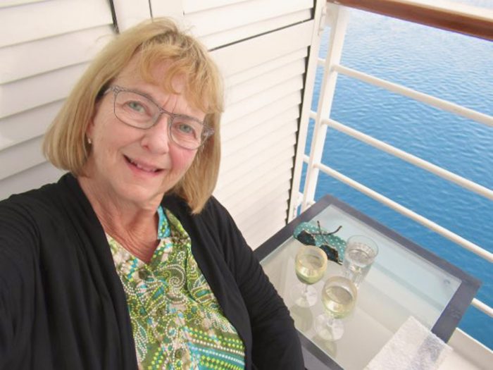 Sailing into the bay was the most dramatic part of the day, seeing the famous boat house of the village of Klima. We almost missed it as the ship was an hour early but fortunately we had just walked out onto the deck. Frankly we may have been the only ones who knew what we were observing, fortunately based on my previous research. But just before that we made a brief stop in the Duty Free shop which is only open when we are at sea ( which isn’t that often, they plan to open at midnight tonight when we sail ) I love my birthday bling sandals. I am going to sparkle at happy hours on the Isla. Milos itself is made up of two main streets which is all you see on a self tour. We had no interest in the beach tour of the other tour being sold. Based on the weather and the small town we chose to stay onboard. Colin is beginning to feel bit under the weather and he rested while I sat out on our balcony reading and drinking a few glasses of wine. Don’t miss my birthday selfie. We are moored out at sea and tenders are being used to take everyone to the island. They are being launched four levels directly below us, so it was fun watching. I did notice that those who went over to Milos on their own to tour the town were back in less than an hour.