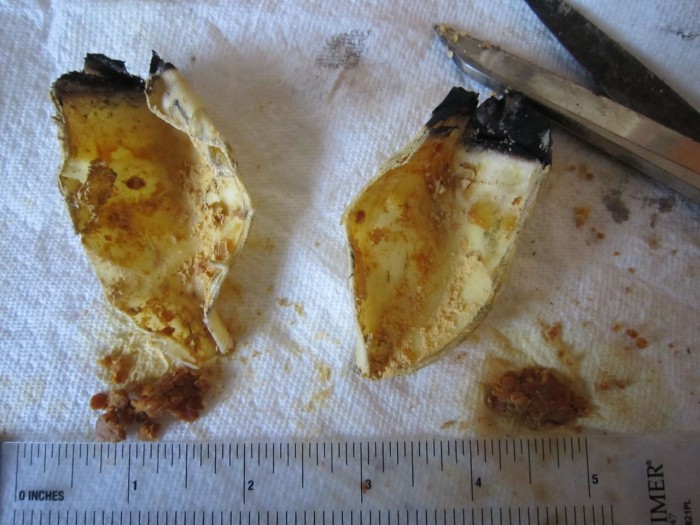 There are certain procedures to follow but it is time to extinguish the candle when down to two inches. Colin always has 2 bowls of water standing by as well as a fire extinguisher…just in case! At this point it is always fun to cut open the remaining piece of candle and see how much wax was extracted. I do this a minimum of every 2 months and I am always surprised at how much wax is extracted each time.