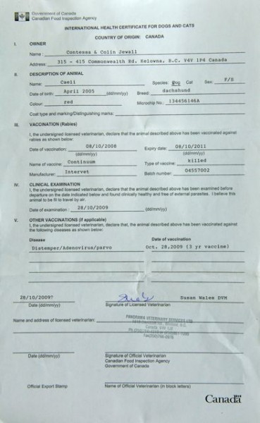 The last thing we do is have the vet see them the last week before we leave for their annual physical and any shots due and she fills out this huge International Travel Form. We are good to go.