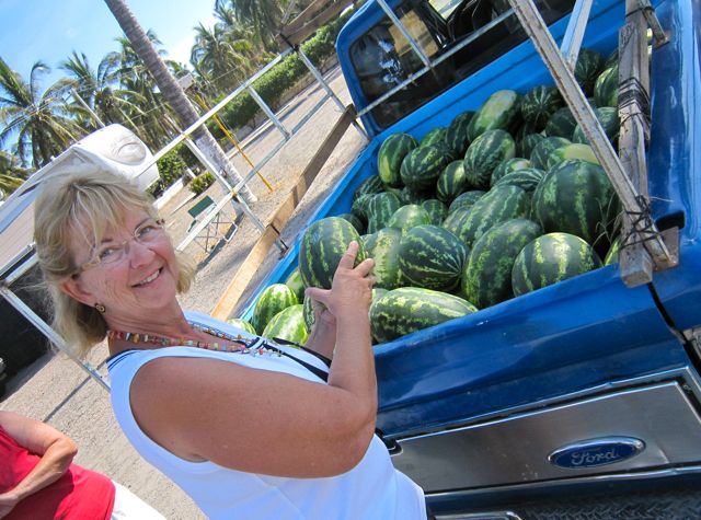 Two veggie trucks come by daily as does the water delivery guy. Now we are getting some fresh watermelon right out of the fields.