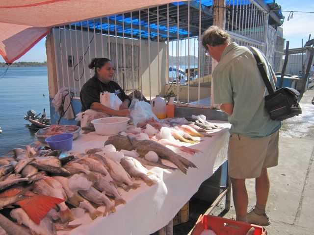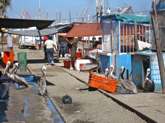 Can you find Colin among the pelicanos?  There is a major fresh fish market just at the embarcadero from Mazatlan to the Isla.  The other day Colin had a hunger pang for Dorado…so off he went to his favorite vendor…