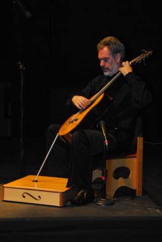 He holds this guitar, which he has amended to 8 strings, like a cello between his legs. The rod has been added to elevate the guitar so he can play it much like a cello but with his own fingers rather than a bow. He also travels with his special chair. Very unique & very impressive says Colin.