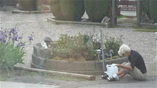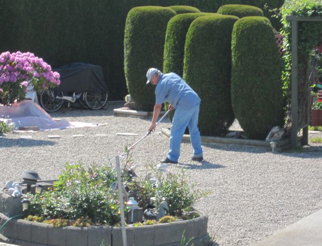 ..then this morning I caught her husband raking his gravel! We have also seen him remove spider webs on a daily basis from all of his shrubs. He is a busy man and can be seen hunting for spiders at night with a flashlight, blowing leaves out of his yard in the fall while the wind just blows them back in. They are wonderful neighbours who are always complaining about how busy they are and how much yard work they have to do.