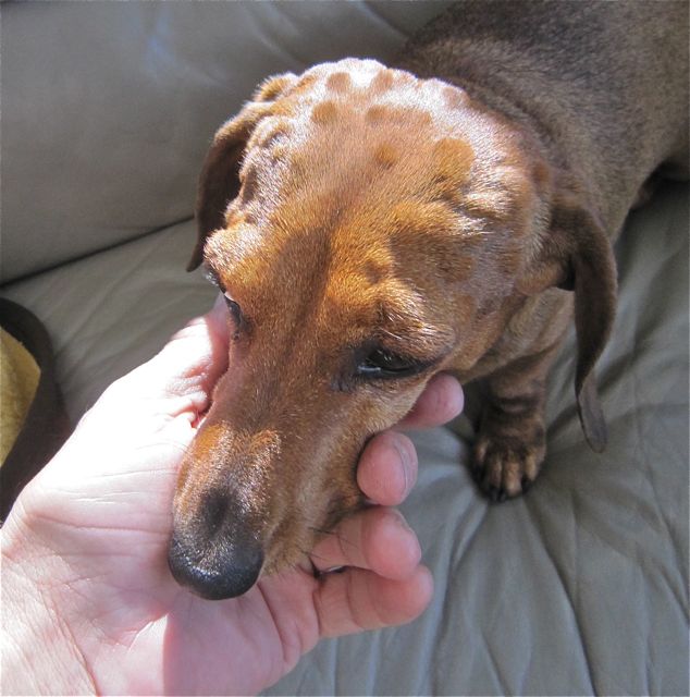 When I saw your babies picture I thought it was my susie. Susie had the exact same bumps all over head and body. Under the bumps were very small scabs. Doc said allery to peanut butter. My friends year old doxie just passed away from bee sting, they got to him too late. I love my 3 dachshunds.