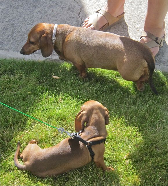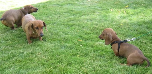 I have been asked to show the difference in size between the new puppy Hilde and our two doxies.  Until Hilde has all her shots we are keeping the girls apart for safety sake.  However we did have one quick visit.