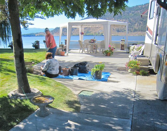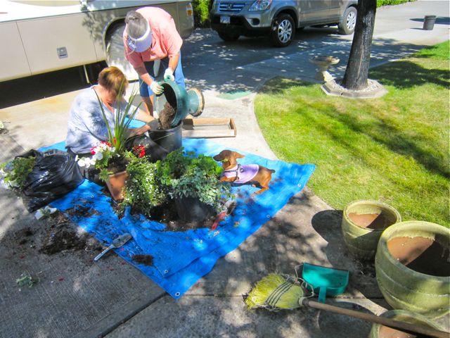 Rather than have Margot throw out all her lovely flowers, I managed to scrounge some pots from the greenhouse here in the park and got Patti involved. As she had moved here so late in the summer she had no flowers. Recycling creatively!!