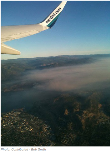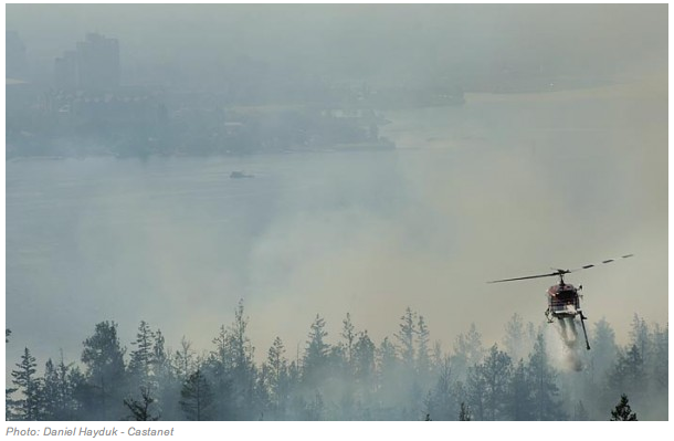 Because of the thick smoke ( can you see downtown Kelowna ) it took a while for the helicopters to start dropping their water. Fortunately the ground crew & the heavy equipment operators were able to slowly begin to contain the fire. .