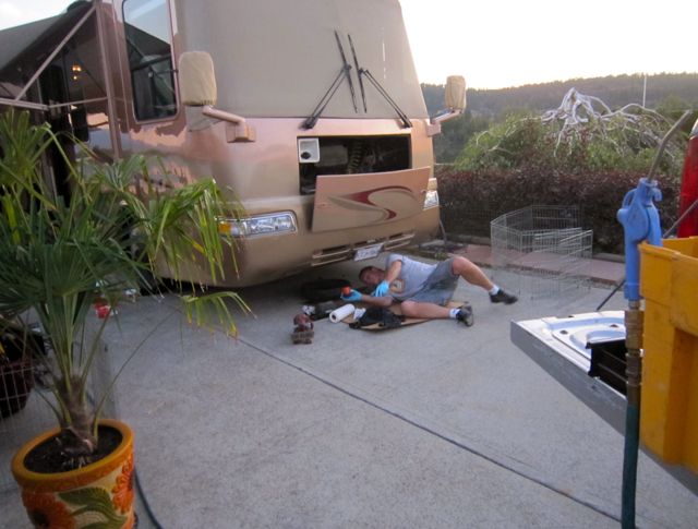 A few weeks ago we brought in our very own RV tech ( we are so lucky to get him to come to us after hours and for after hours prices ) to do several things on the list. I think that here he is doing something to the generator.