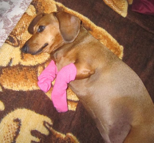 Caeli got insect bites between her toes and would not stop licking the area so I put some salve on and tiny socks to allow the sores to heal.