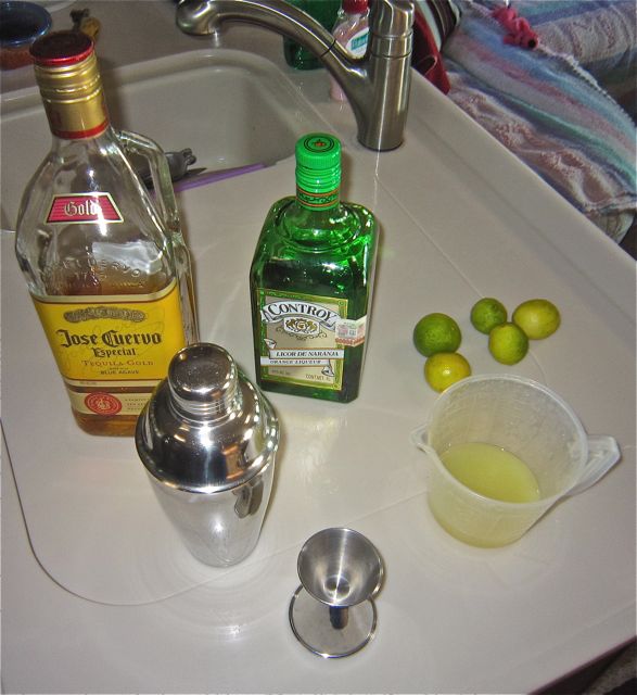 Once you have assembled the necessary ingredients, tequila ( I don't subcribe to the theory of white or gold, any type will do ), Controy known as Triple Sec or Cointreau North of the border ( an orange liqueur ), fresh lime juice, a cocktail shaker and ice, you are ready to proceed.