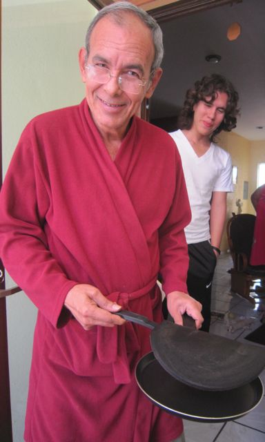 Sunday morning is a traditional pancake breakfast made by Heriberto. He is squeezing oranges for juice while I try to put a blog together and Christian is studying.