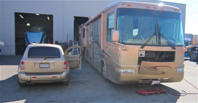 We are at Walker Heavy Duty  in Delta, B.C. right next to the Tsawwassen/Ladner area of Vancouver where we lived for many years before moving to Kelowna.  We have been bringing our DP here since it was born and the mechanics are very familiar with our RV.  After moving to Kelowna about 8 or 9 years ago ( who is actually counting and do you really care???) we developed a routine where we would cross into Canada on a Friday morning, brign the RV in for ita annual service and see Katie and Louie, a good break from the driving.  The next day we drove home giving us the rest of the weekend to unload and get to work on the Monday.  Well it works for us.