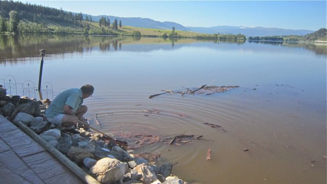Once at the lakeside we notice that the lake has risen close to 3 feet and branches and 'stuff' are becoming caught up on our rocks. Colin decided to try and clear what he could to prevent too bad of a future mess. Our beach is long gone.