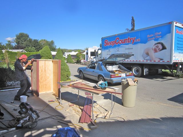 Friday brought some change, our new king size mattress was delivered. I know we are going to love the upgrade from a queen. Rick keeps working on coverings for our propane tank and water box.