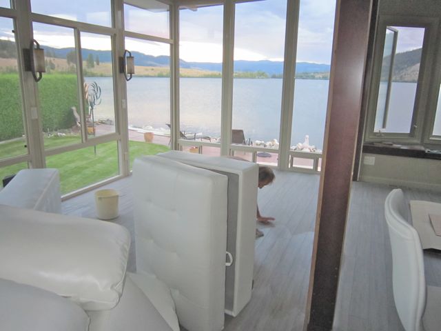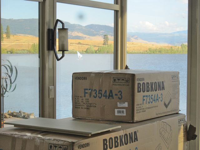 Then our new sectional was delivered....to the curb!!! For $150.00 more they would have brought it into the house!!! Thankfully our trades people helped me out, as Colin was on a photo shoot. Can you make out the windsurfer on the lake, to the right of the wall sconce? Can you see the new dust spot in my camera lens above the surfer.....grrrr????