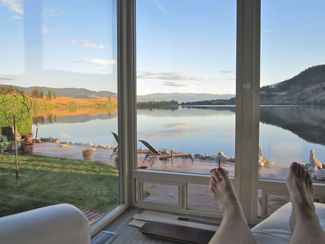 Terrific view of a pair of feet backed up by a great view of some lake or other! Seriously, that window view is terrific, know it well but this is from another angle. Love the windows. KenB