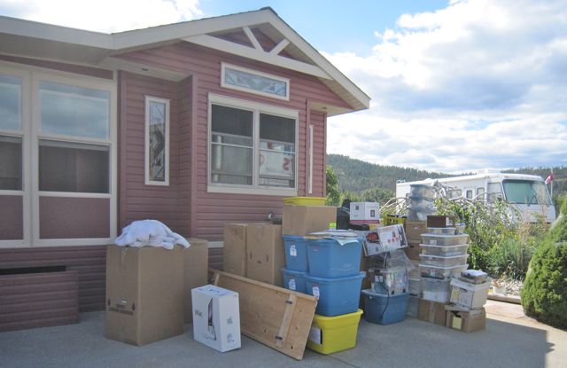 Part 3 of the move was moving all the boxes from under our old house, which was full, and carting them across the road. This shows about 20% of the boxes. The movers would not go under the house so Colin & Gord had to crawl under and push the boxes out. Some were for inside, dishes, books, clothes, etc. but many were for under the new house. It seemed overwhelming even to the movers. We asked if they would stay another hour and help Colin put the stuff under the new house, move the sauna and rebuild it and carry the wardrobe boxes inside.