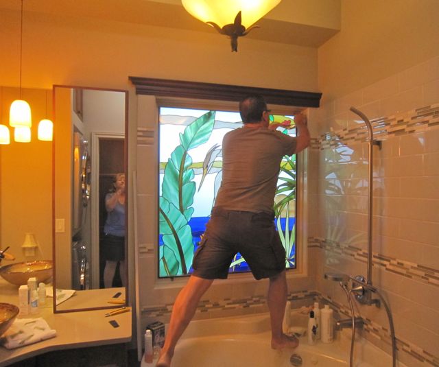 Your stained glass window looks beautiful. I love the way it looks like a framed picture in one room and a stained window in the bathroom.