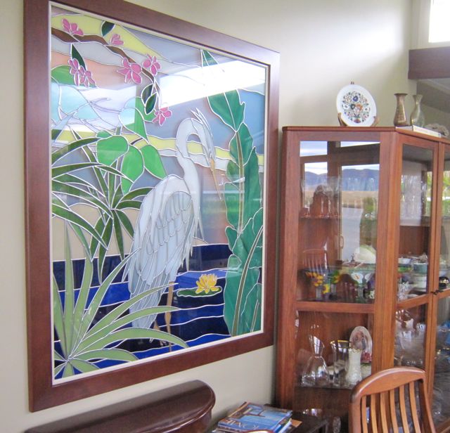 Ken….we love it also…..we commissioned it in May and it took till now. We did send him some photos of the type of heron we liked, he chose this one over a blue heron, asked for certain things but the plumeria was mandatory…..he added a great deal of his artistic appeal. the one thing we learned while working with him is that he is not always happy with a piece he made. He loves this one.