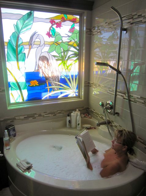 Things sure are coming together, the stained glass looks awesome. Enjoy the tub while you can, you are going to miss it while on the Isla!