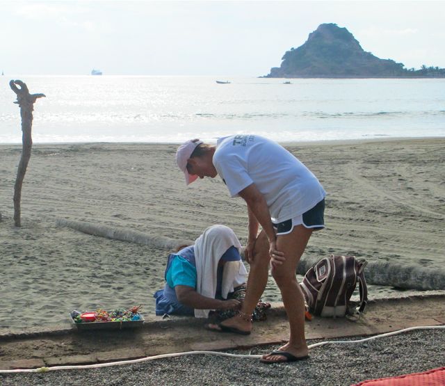 This will be the 4th winter that beach vendor Filomena has been visiting us. Our Louisiana neighbor Linda getting fitted for an ankle bracelet. For some reason this year all the flower seeds I planted along that front strip have not germinated. Bad soil? Bad seeds?
