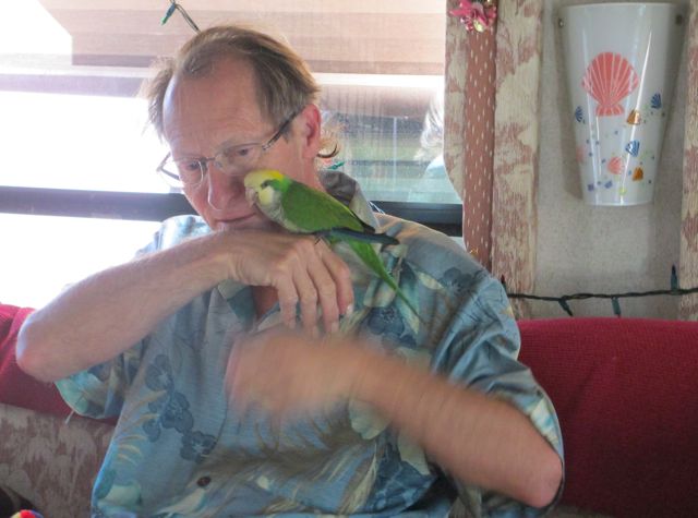 The bird can fly and everyday becomes more adept at it.  Not sure what the future will hold for Chiquito.  We can't see him being in a cage for the 7 months we are back in Canada.  After having the freedom of flying around the RV I think it would be cruel. There will be changes for certain but first Colin will have a chat with our avian vet here in Mazatlan.
