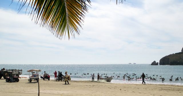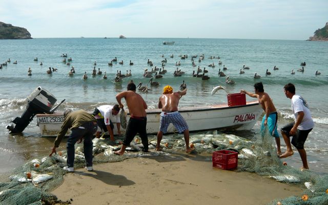 Our neighbour Bob had been sitting outside watching a school of yellow finned fish out in the bay when he noticed a local group of fishermen jump into their barca and quickly drop a net. Shortly thereafter the net was being pulled in.