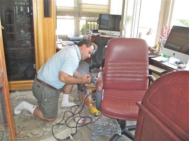 Yesterday, Yves from Fibre New came to touch up the many marks and scatches on my leather desk chair. It looks just like new. A great deal for $70.00. Not sure if you can see but Colin sits on a ball chair. FYI that is our infrared sauna on the left.