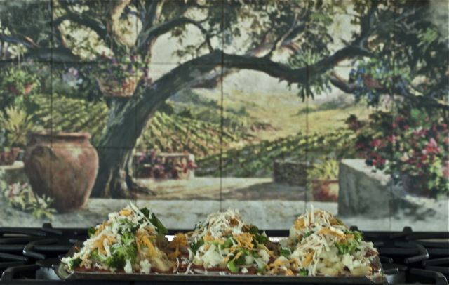 Struggling to deal with this gluten thing so we use corn tortillas as a base and mound up the veggies with cheese on top. I made 6 but we couldn't eat more than 2 each and that was a struggle.