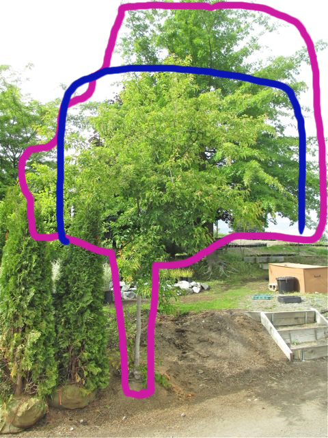 My first attempt at photoshop under the guidance of Colin. The pink is the existing tree but we will likely trim it to what is within the blue area. We both love the tree and the price closed the deal.