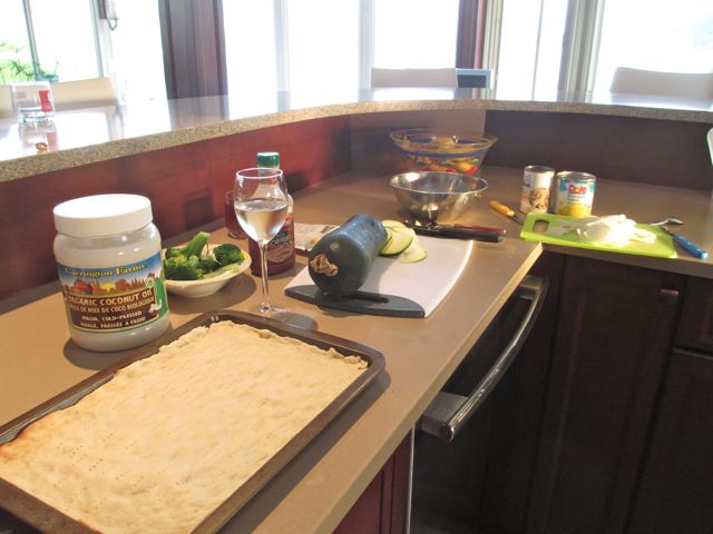 On the base I add pizza sauce, thinly sliced vidalia onions, thinly sliced fresh from the garden ( not ours but a friend's ) zucchini, fresh steamed broccoli, mushrooms and canned pineapple tidbits topped with 3 different types of cheese.