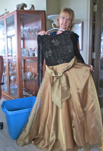 I LOVE my gold and black ball gown complete with crinolines. I danced my best Viennese Waltz in this gown at the Hotel Vancouver many years ago. But it takes up so very very much space. It has been put into that blue bin you see and will go under the house marked evening clothes.