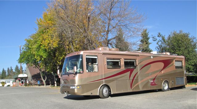 Once we moved it onto the RV pad he checked the tire pressures and filled them as needed. One inside dually was really low. The jacks are down, slides out, electricity plugged in and the fridge turned on. Looks like we just might be getting ready to go. Finally things are starting to come together.