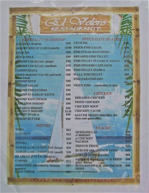 The menu for my Mazatlan readers who might like to come by for lunch one day! The margaritas were only 50 pesos. The second one was as good as the first 😆