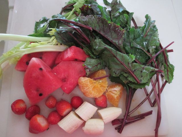 Beet tops & celery for the veggie part plus banana, orange, watermelon, strawberries and protein powder. Today my smoothie is a lovely pink color. I never know if today will be a smoothie day, one has to be flexible based on available ingredients. I hope for spinach for tomorrow.