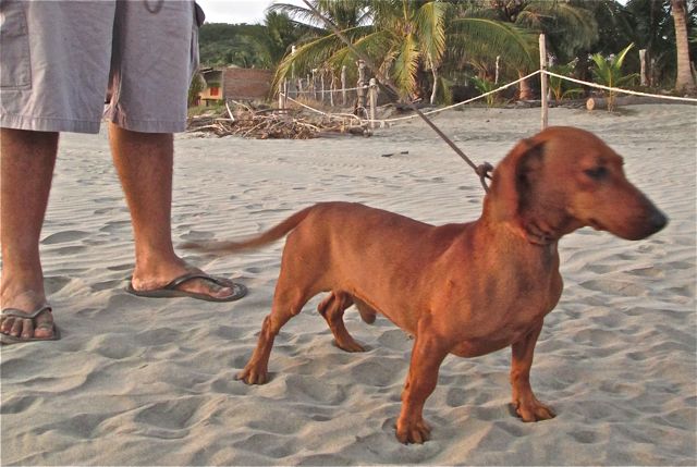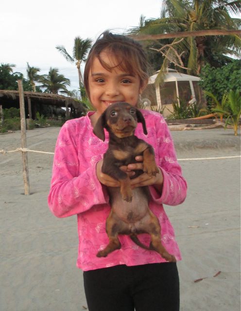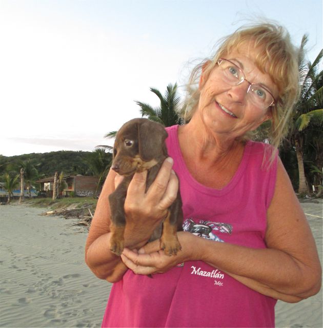 Her name is Lacey and she is three months old. I asked the age several times because she is to tiny, smaller than our girls at 8 weeks. She only has 3 toes on each of her back feet. She couldn't stop shaking. Isn't she sweet, a face to love. I have never seen a chocolate doxie in Mexico before.
