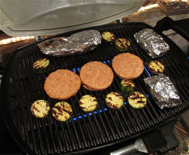 We are still eating well and so glad we bought the larger Weber. How else would we have room for 3 salmon patties, 2 baked potatoes, a large package of onions and all that squash that had been marinated in coconut oil. It was a gourmet meal and tasted every bit as great as it looks.