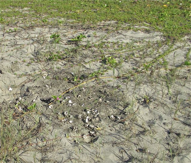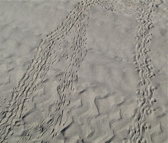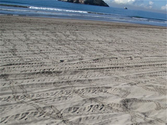 Further down the beach, we found more turtle tracks. Those are the ones on the right, the middle tracks are crabs and the ones on the left are mixed.. As it turns out, 5 nests had hatched that night/day.