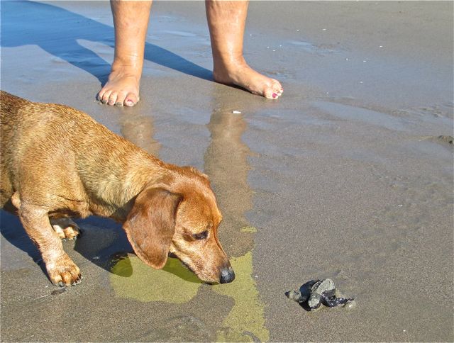 Carmeh quietly watched the beginning of its journey. See how her paw is up in the air. I was amazed at how gentle she was. The girls do hunt crabs but did respect the turtle.