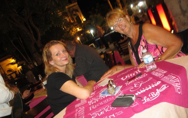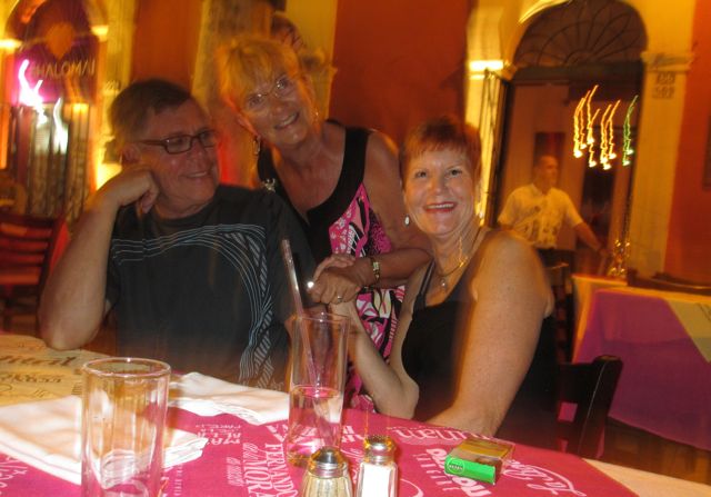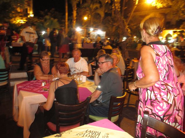 By now we had been looking for the folks we were dining with for about 45 minutes. It was a bit tricky as we had never set eyes on them before, nor they us.  We had decided on a restaurant but all the good tables, in my opinion, were full so we sat just 2 tables over at another restaurant keeping our eyes peeled for them.  Between us we must have got up three times asking strangers if they were so and so.  Nada, but one fellow who knows them said they were not there.  So we waited.  Finally I sent Colin over to a table where a couple were having drinks.  I didn’t think it was them as they didn’t seem to be looking out for anyone to join them but I thought we should ask just in case and of course it was.  As they had gone ahead and ordered their meals ( I guess they thought we were not coming ) we brought our drinks over to them and proceeded to have a wee visit.