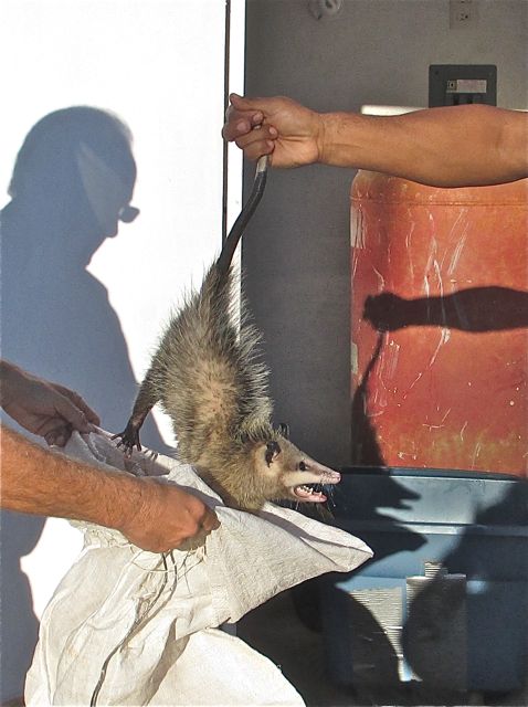 At this point the possum got it's head out of the bag and Ishmael calmly placed his hand around the jaws in order to not get bit and pushed it back into the sack.