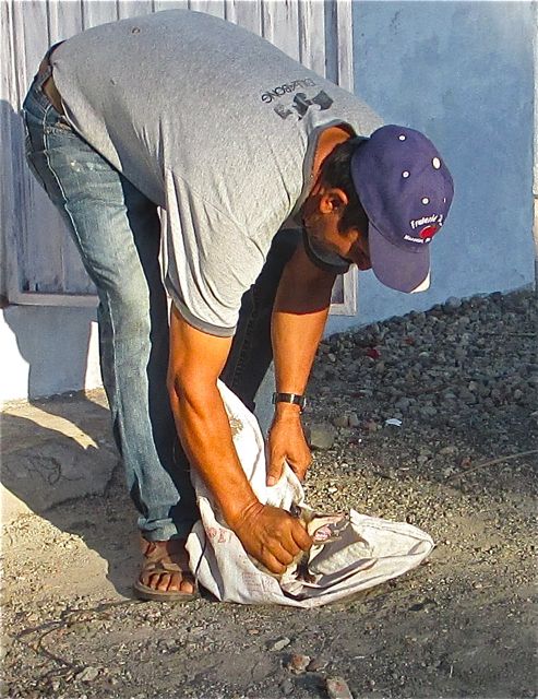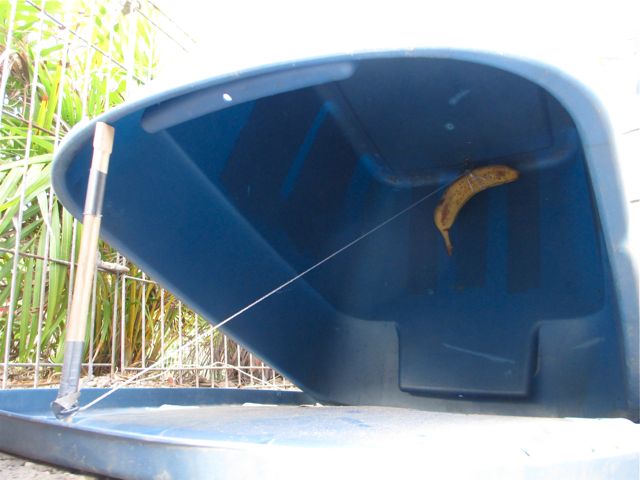 When we cooked our dorado the other night Colin kept a piece of the raw fish for bait. He then borrowed the rat trap from John and very carefully tied the string around and around and around the piece of fish and place the rat trap just so within our trap so it would shut even quicker than it had before. It was a matter of leverage and balance. Colin was tired of this critter outwitting him.