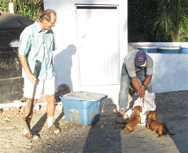 Colin was holding the shovel in case we had to hit the critter on the head if it ran away. The girls had been hollering with the sent of a huge rat just on the other side of their fence. Between them they pushed so hard that they breached the fence and got to the sack. Caeli, our mild little doxie who likes to sleep, was on the attack, trying to rip the sack open with her teeth.