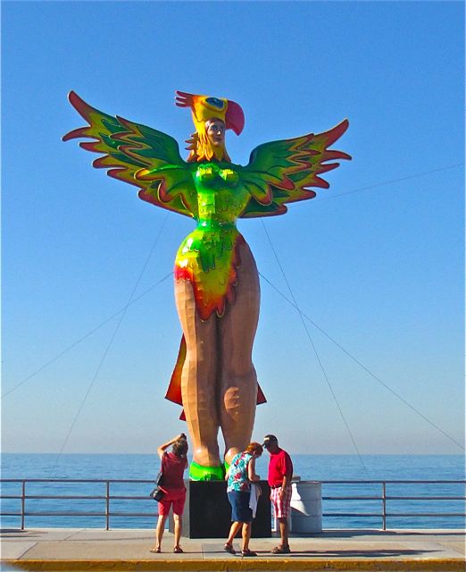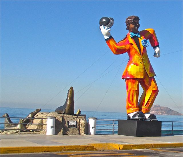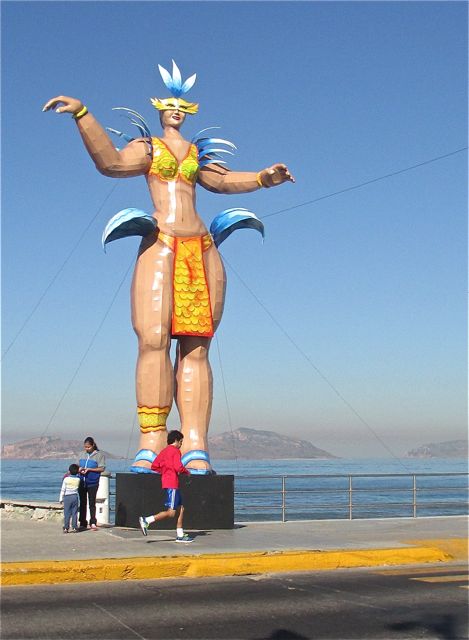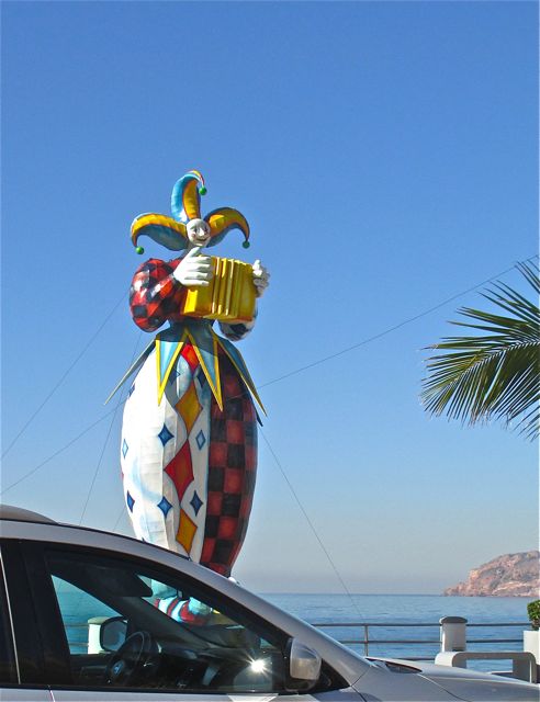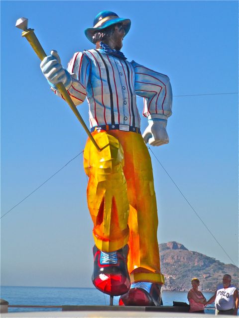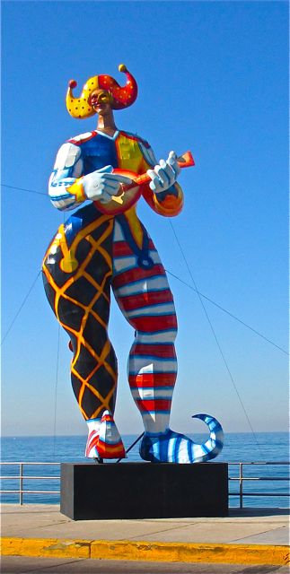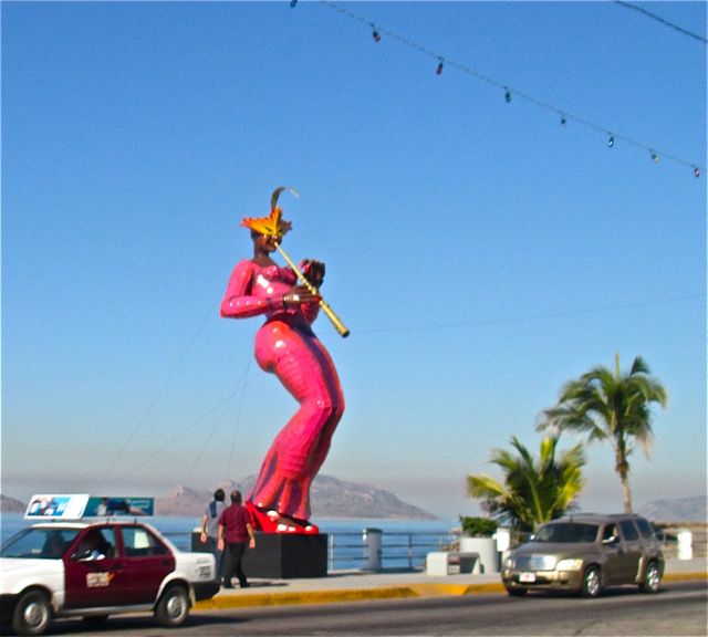 Last Saturday enroute to my dentista we were able to see nine of the ten giant paper mache statutes lining the malacon here in Mazatlan.  Our pulmonia driver kindly slowed just enough at each statue for me to take a quick shot.